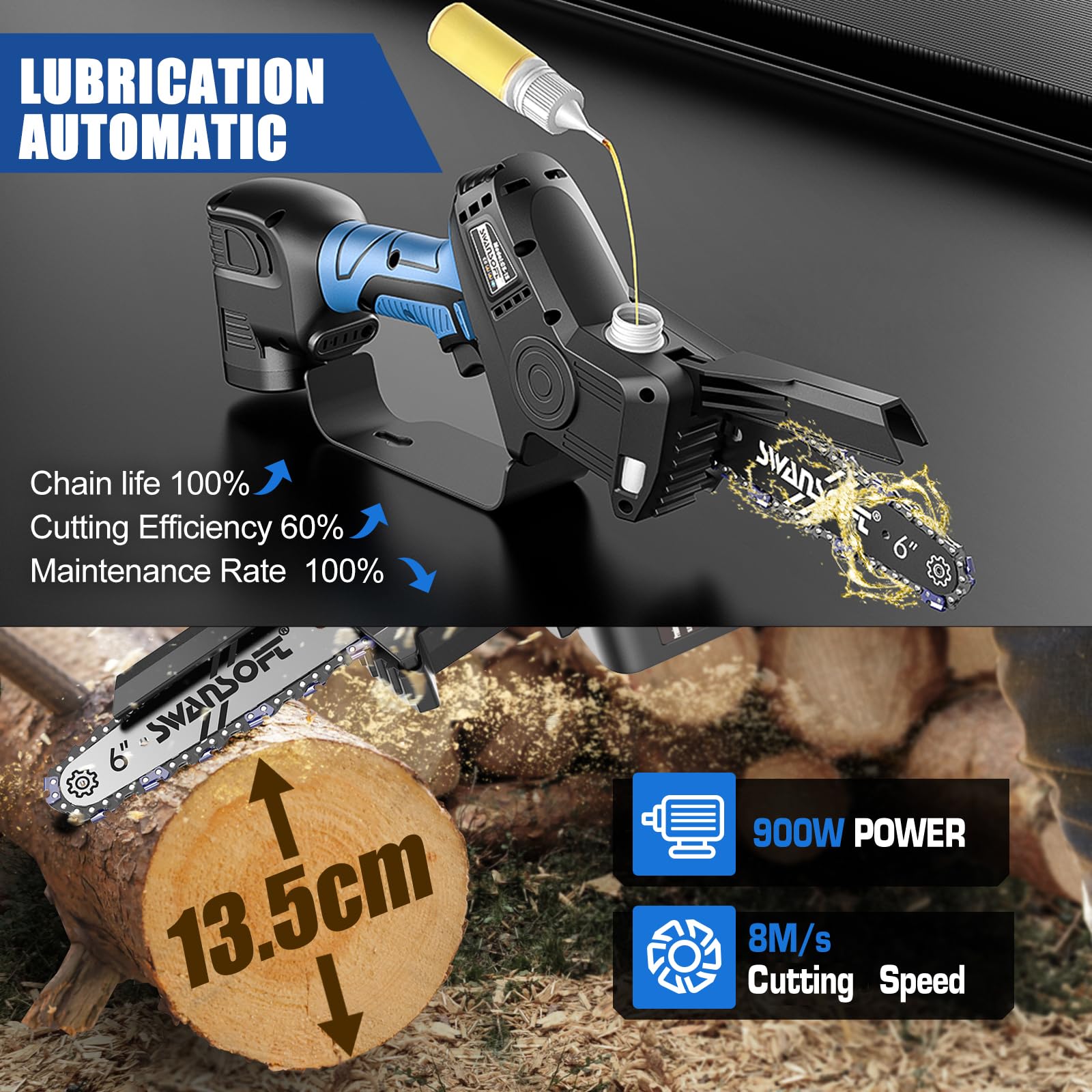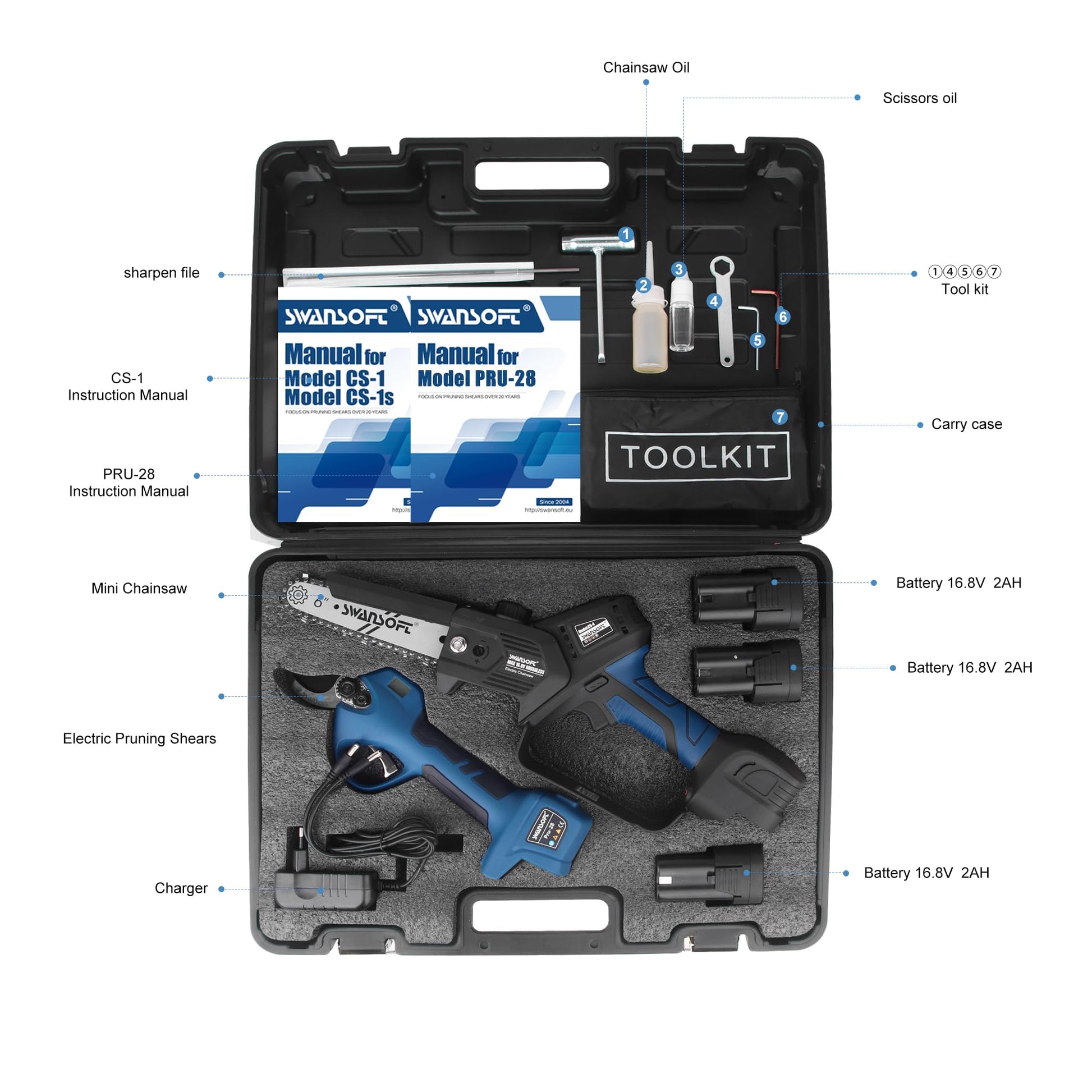 SWANSOFT PRU28 2-in-1 Schnittset: Akku-Schere & 6" Akku-Kettensäge, inkl. 3 Akkus – ideal für Gartenarbeit & Heimwerker (146 Zeichen)